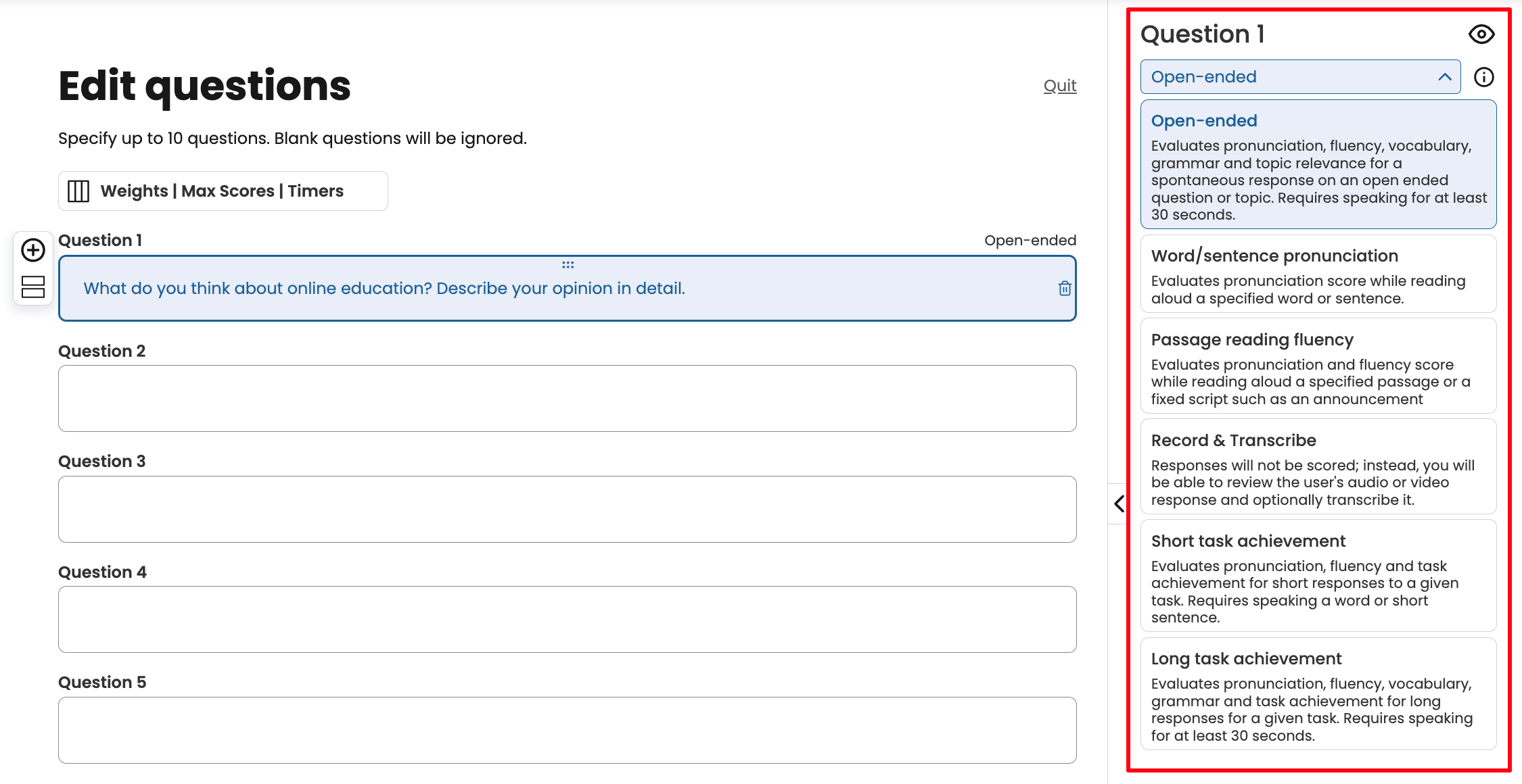 You can add up to **10 questions of different types**. If you need to add more than 10 questions, please contact support at **<contact@speechace.com>** to request a limit extension.