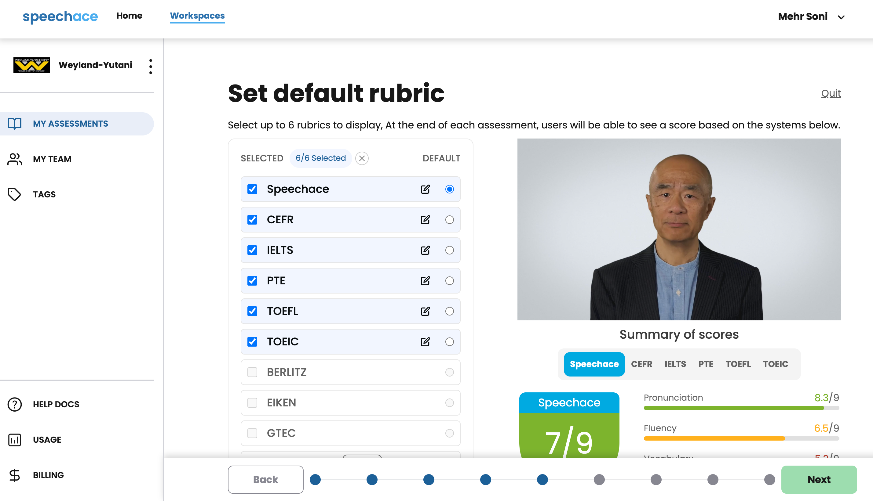 Choose up to **six rubrics** to evaluate the assessment. At the end of the assessment, test takers will see the scores based on these selected rubrics.&#x20;