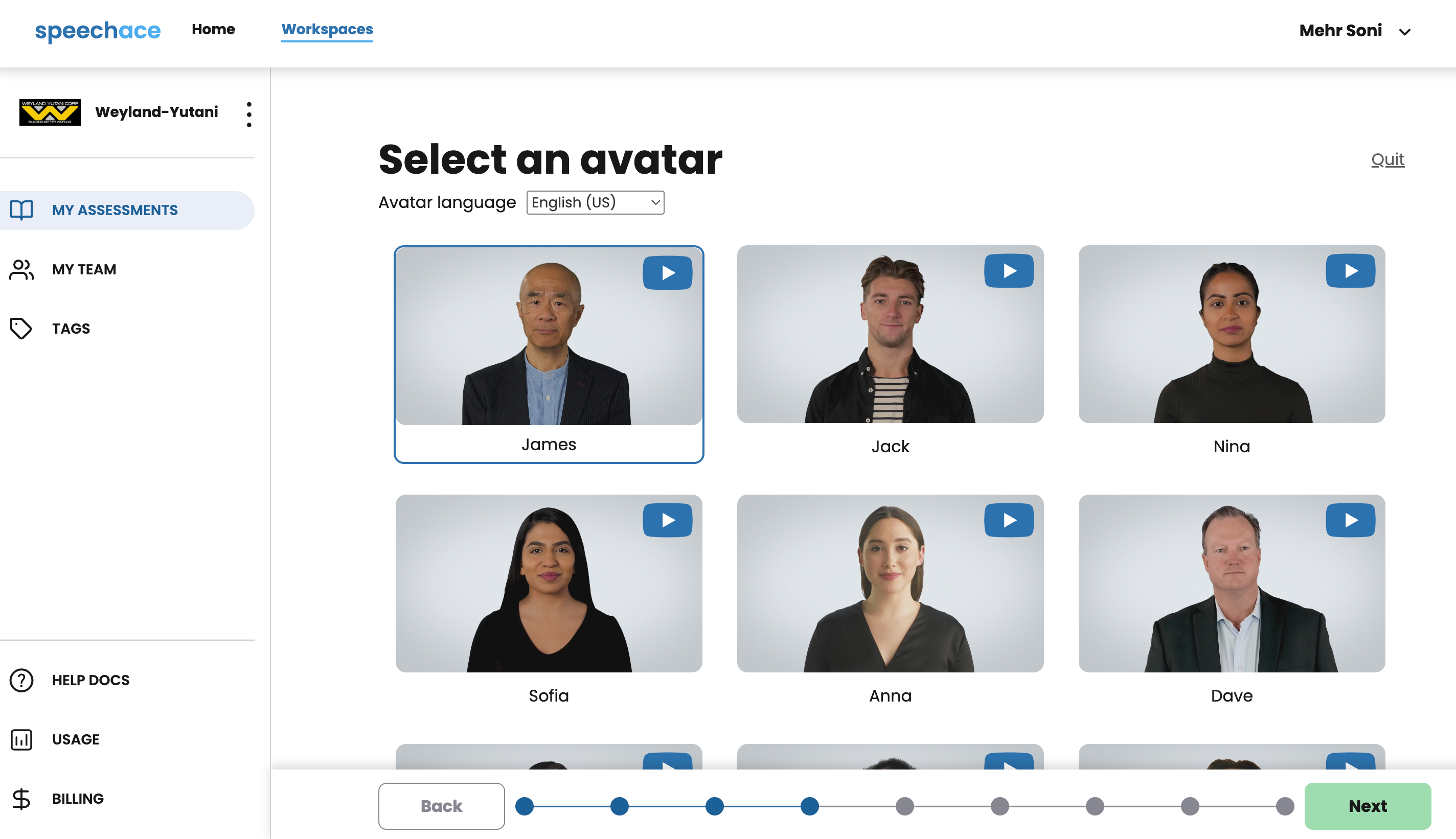 Choose an avatar for your assessment. Click the **Play** button next to an avatar to hear how it sounds. You can also select the language of the avatar that best matches your assessment needs.