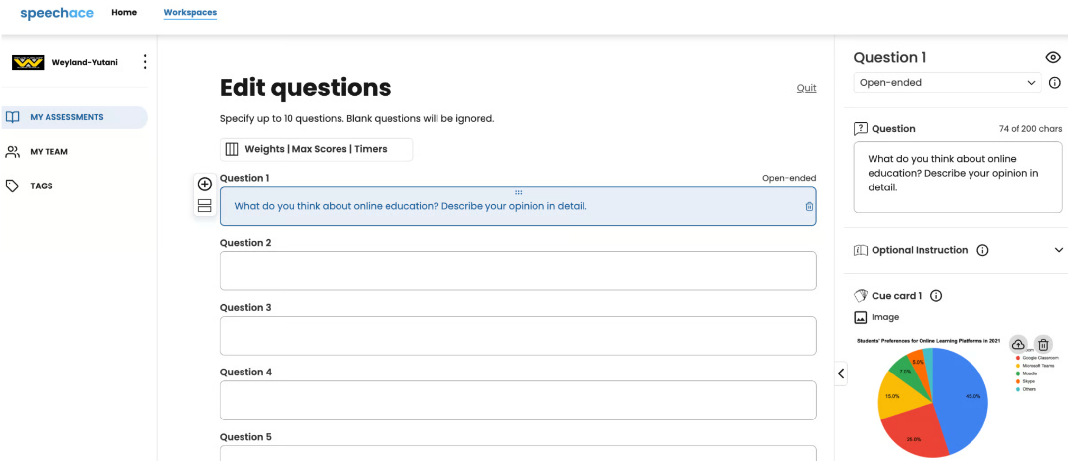 Refer the [type of questions](https://speaking-test-docs.speechace.com/speechace-speaking-test/speechace-workspaces-create-manage-and-share-speaking-assessments/creating-assessments/create-new-custom-assessments/custom-assessment-configurations/types-of-questions) guide for more information of various question types and its uses.