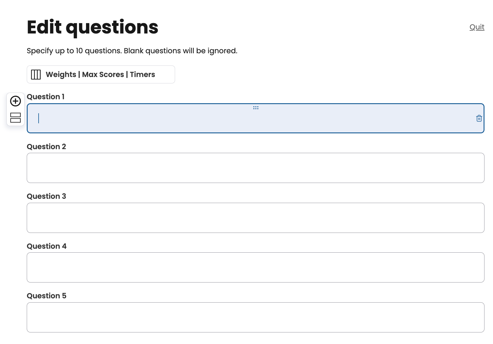 To start adding your questions, click within any question field. You can add more questions using the "➕" icon or you can create question groups by clicking the "🟰" icon, as shown in the image below.