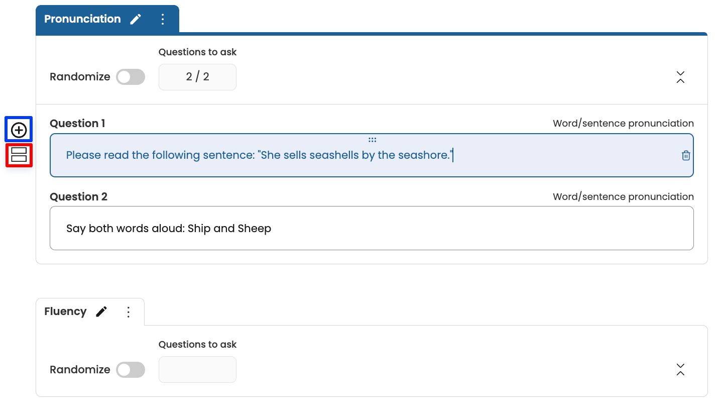 Speechace provides a robust way for you to manage your assessment content by creating different question groups for various topics, skills, and difficulty levels. This grouping allows you to streamline question management, select a specific number of questions from each group and randomize their order within those groups.