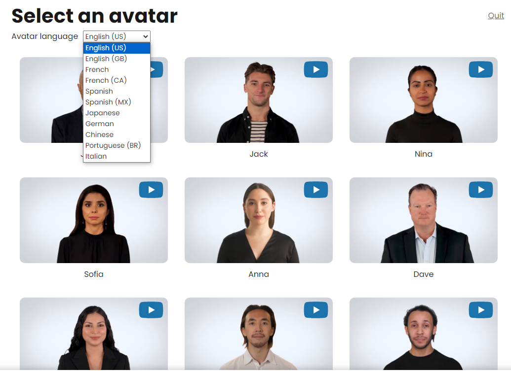 While creating a custom assessment, you will first select the language of avatar narration script. Selecting a language shows you the avatars available in that language.&#x20;