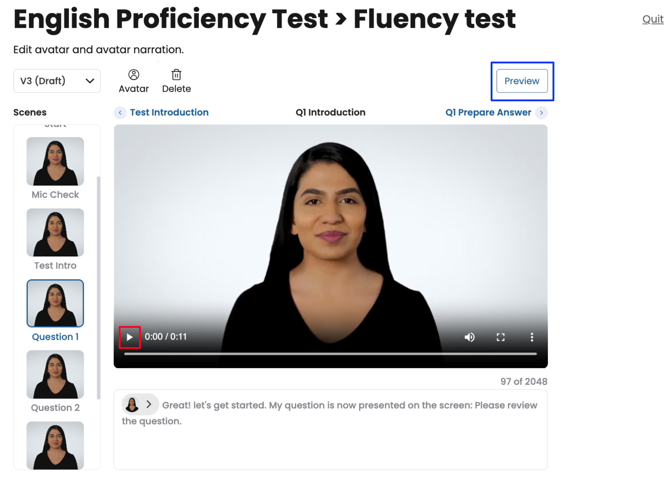 After making changes, you can playback each scene with the new avatar by clicking the Play button highlighted in Red in image below. Alternatively, you can preview the full assessment by clicking the Preview button highlighted in Blue.