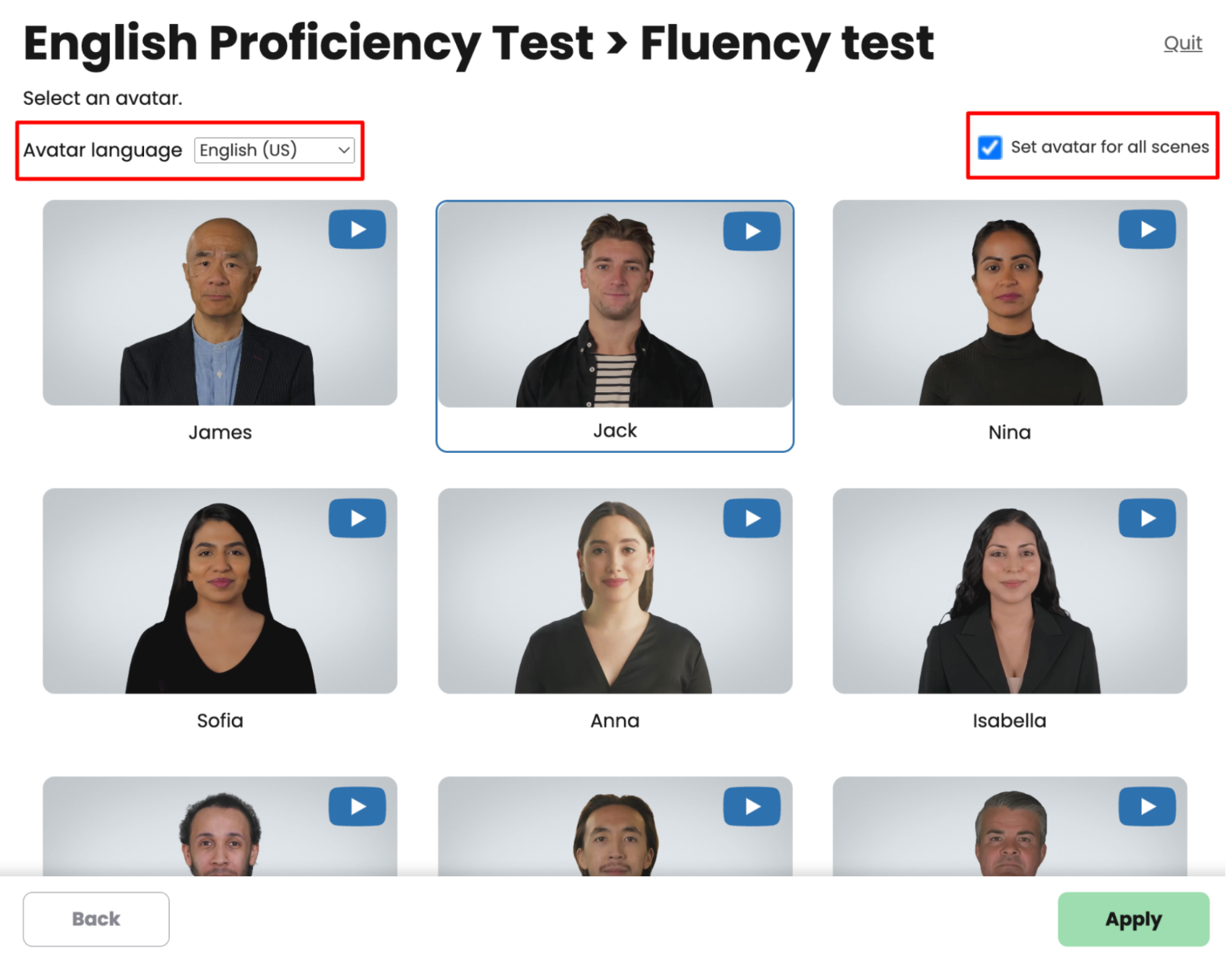 If the checkbox is checked, the selected avatar and language will apply to every scene in the assessment.