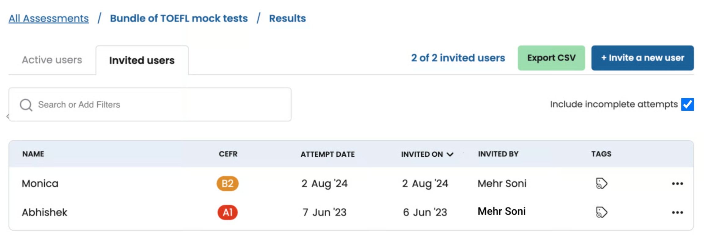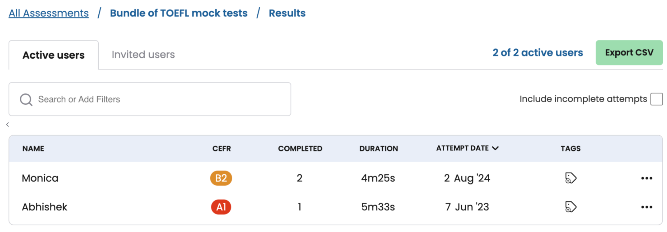 You can now click on individual user names to see their detailed performance in the form of a [detailed report](https://speaking-test-docs.speechace.com/speechace-speaking-test/detailed-test-report) of assessment. You may also export these results in to a CSV file using the Export CSV button.